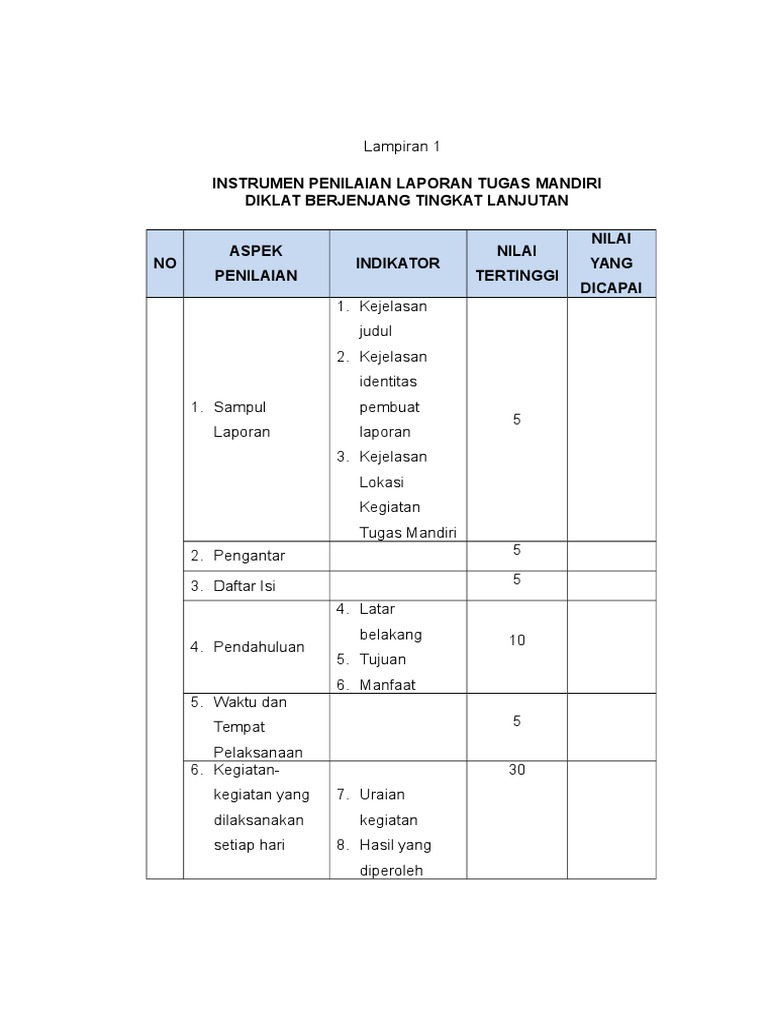Direktorat pgtk paud dan dikmas sejak bulan maret 2018 telah menandatangani dan menerbitkan pedoman /juklak, sop diklat dan sop tugas mandiri diklat berjenjang bagi guru paud yang baru. Contoh laporan tugas mandiri diklat dasar paud.banyuasin april 2017 penulis zuhria irmayana lembar pengesahan laporan tugas mandiri diklat berjenjang tingkat dasar bagi pendidik paud di susun oleh zuhria irmayana diajukan sebagai persyaratan kelulusan diklat berjenjang tingkat dasar banyuasin 10 april 2017 ketua pelaksana disetujui pendamping ernidayati s. Jl.diponegoro ungaran tanggal pelaksanaan diklat : Contoh laporan tugas mandiri diklat berjenjang tingkat dasar bagi pendidik dan tenaga kependidikan paud 2018 2019 salam semangat buat seluruh pendidik dan tenaga kependidikan paud hebat. 12 desember s.d 16 desember 2016 tugas mandiri tempat pelaksanaan :